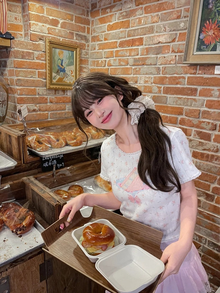 White Cake Print Lace Trim Sweet Floral T-Shirt