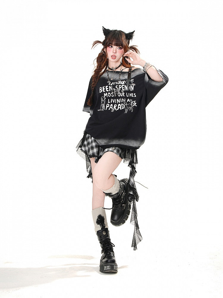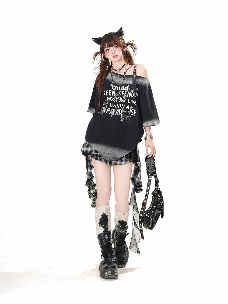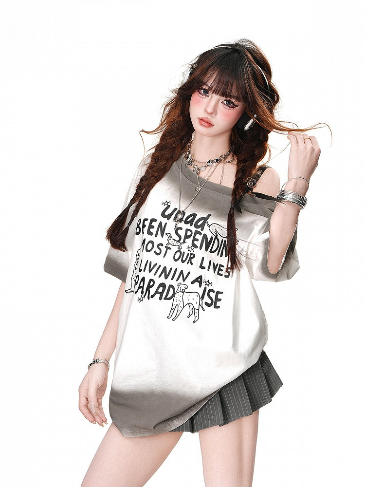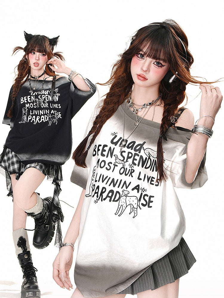 Adorable Puppy Print Asymmetrical Neckline Heart Buckle White/Black Loose T-shirt