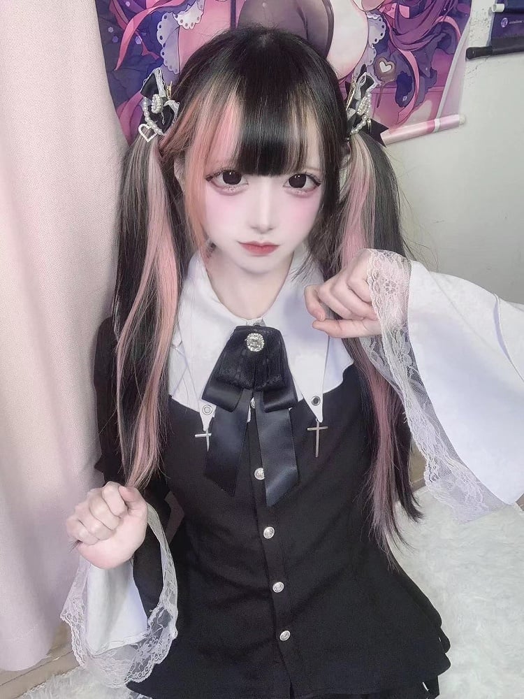 Tiered Lace Gothic Flat Skirt Collar with + Set: Two-Piece White and Black Bell Pointed Trim Sleeves Top