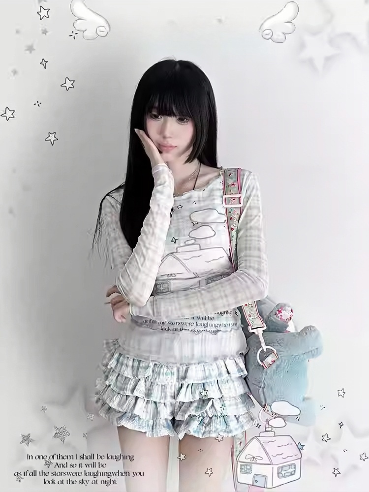 Blue Plaid Pattern House Print Faux Two-Pieces Top/Modal Tiered Ruffles Skort