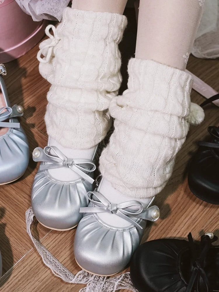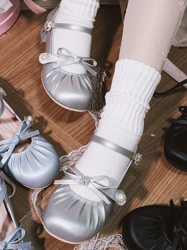 Round Toe Silver Sweet Mary Janes - Knotted Bow at Top & Rhinestone Heart Buckle