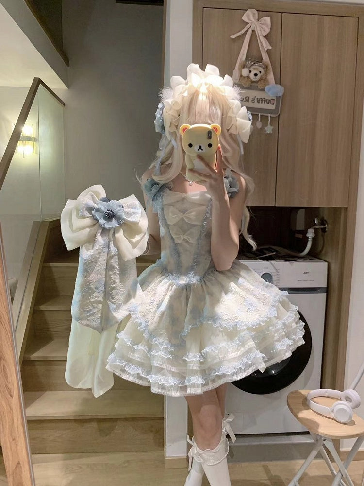 Blue and White Old School Lolita Fashion Dress Bowknot Detais JSK Set
