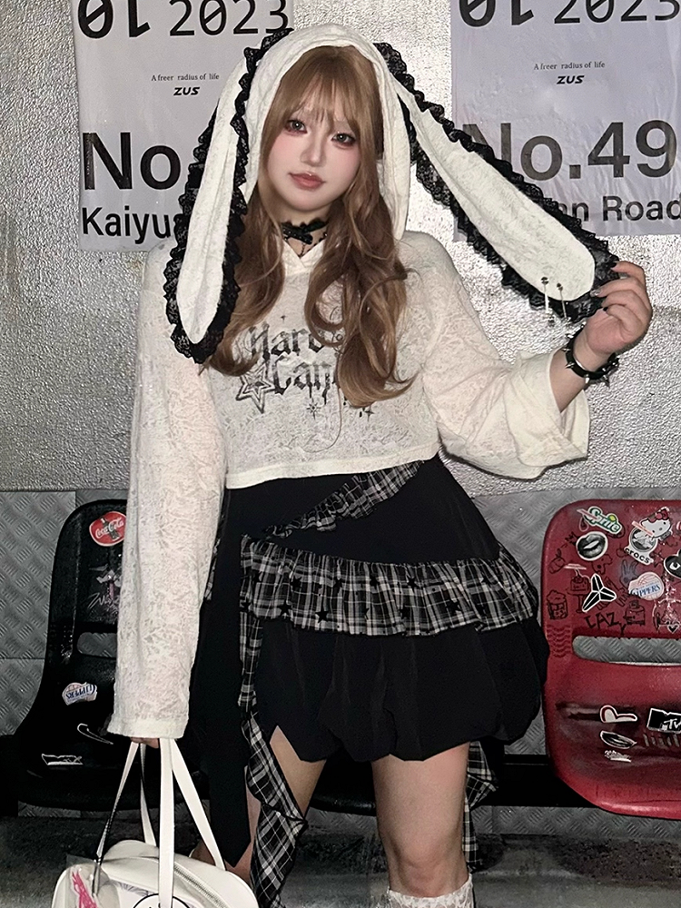 Trim Coverup with Bunny Ears Design White Semi-sheer Lace Plus Black and Size