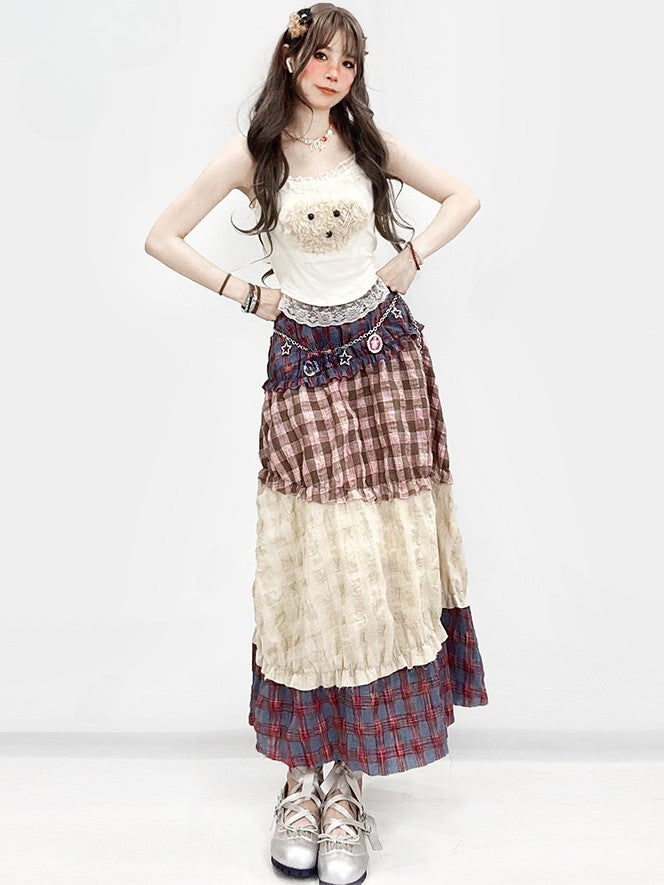 Pink Bittersweet Plaid Pattern Ruffles Trim Tiered Skirt