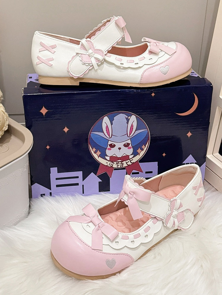 Pink Flats in PU with Scalloped Trim, Bow Decor & Heart Details
