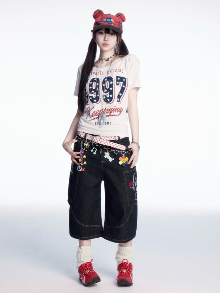 Black Low Waist Heart Embroidery Wide-leg Cargo Jeans