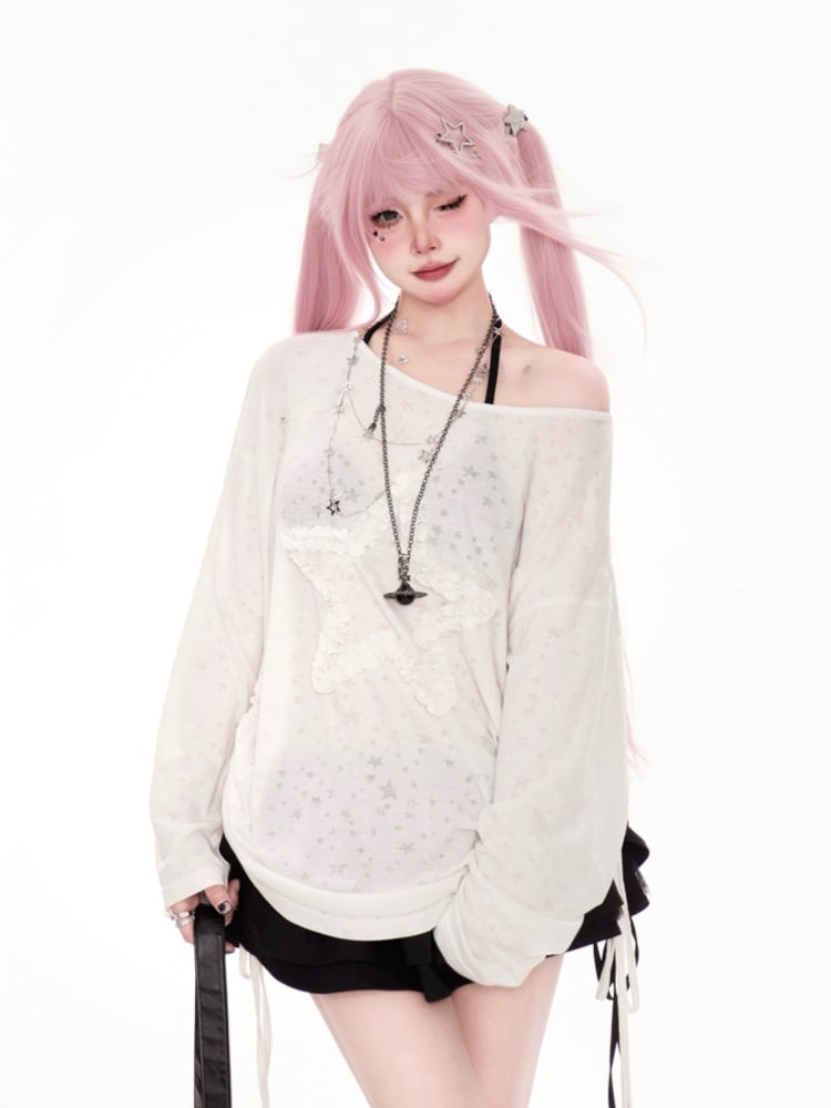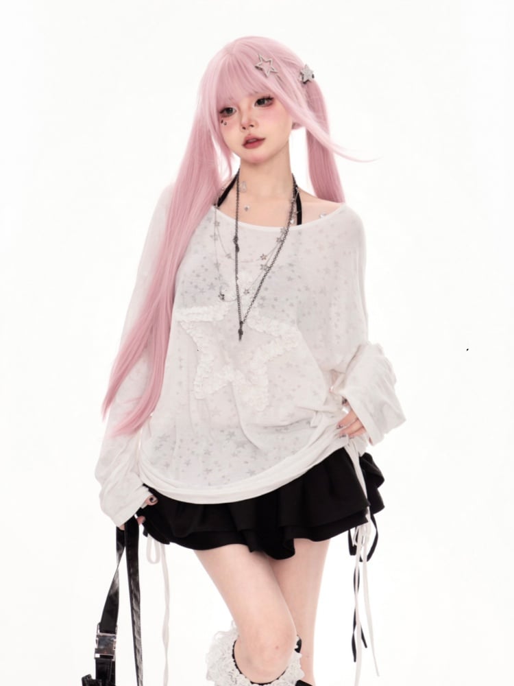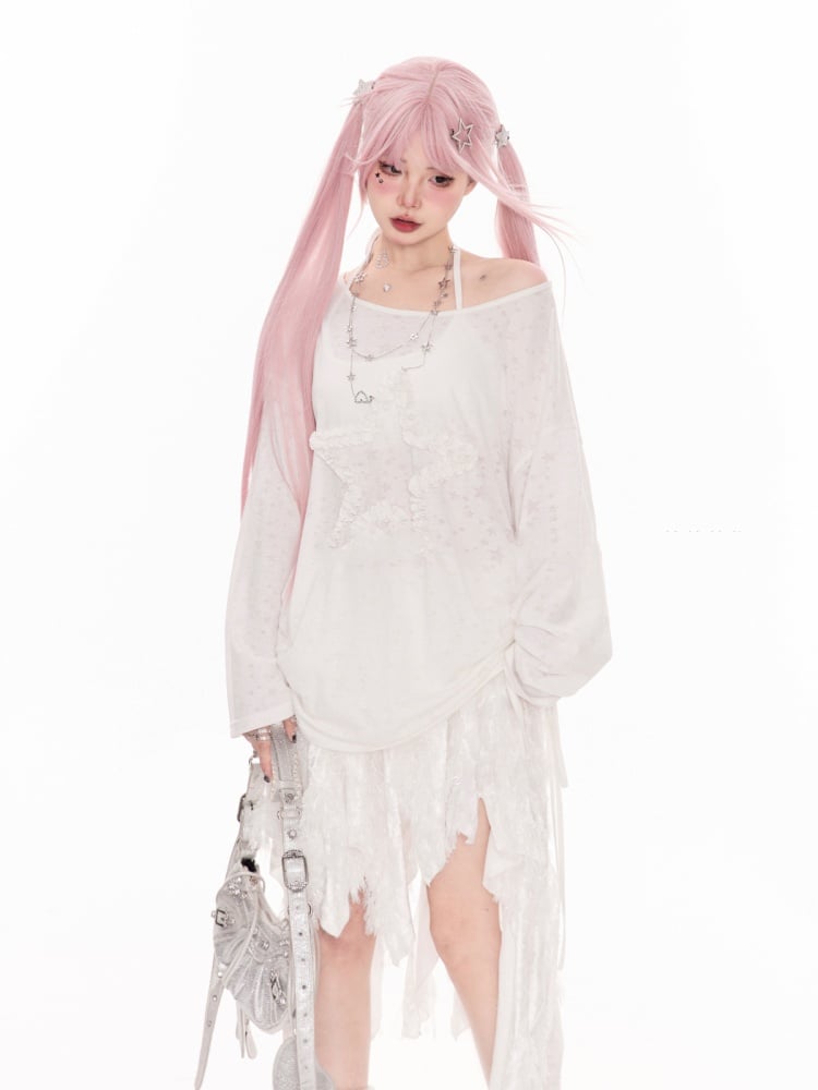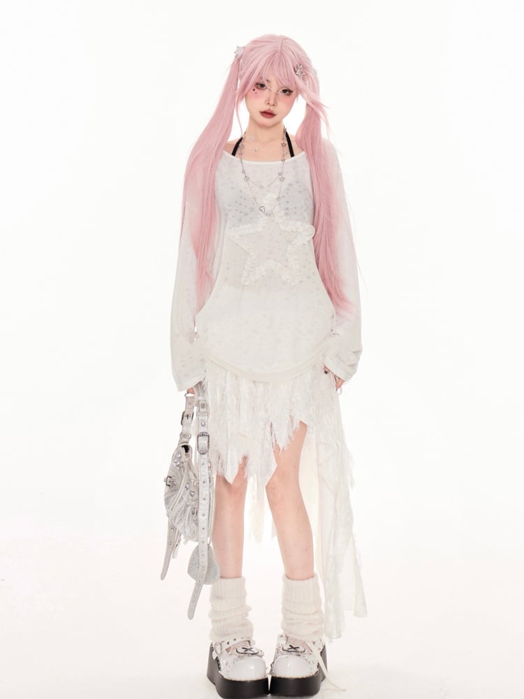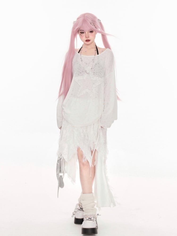 White Asymmetrical Neckline Ruffled Star Drawstring Side Coverup