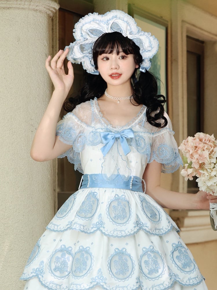 Blue and White Old School Lolita Fashion Dress Bowknot Detais JSK Set