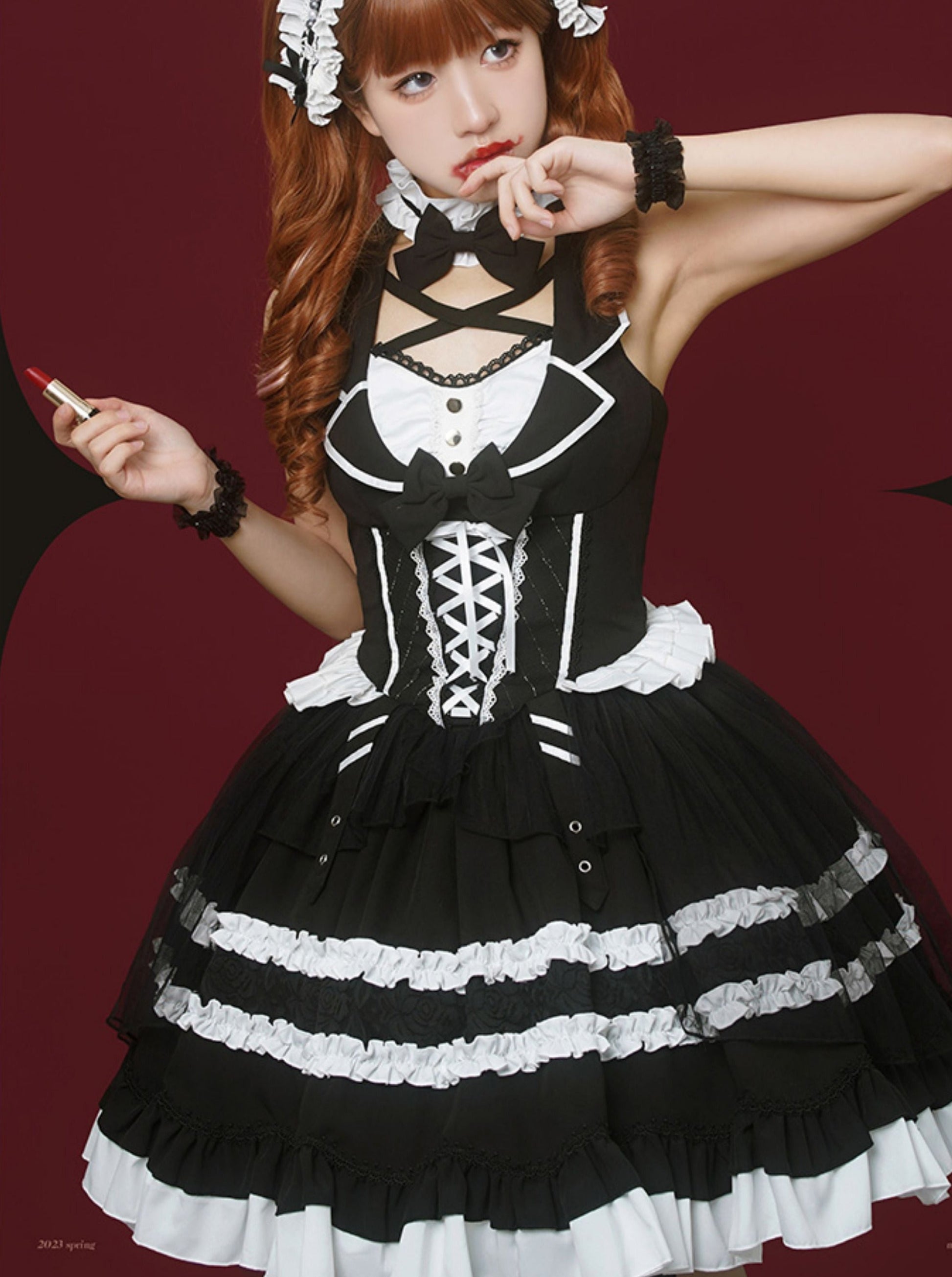 Black and White Old School Lolita Fashion Dress Bowknot Lolita JSK Set