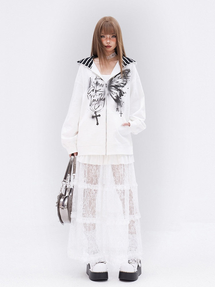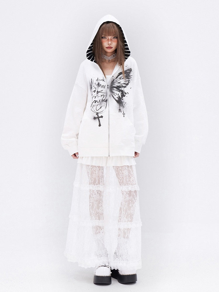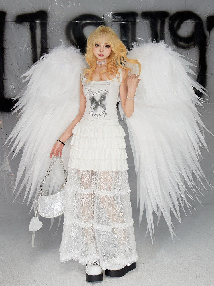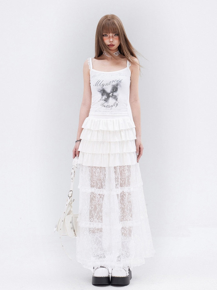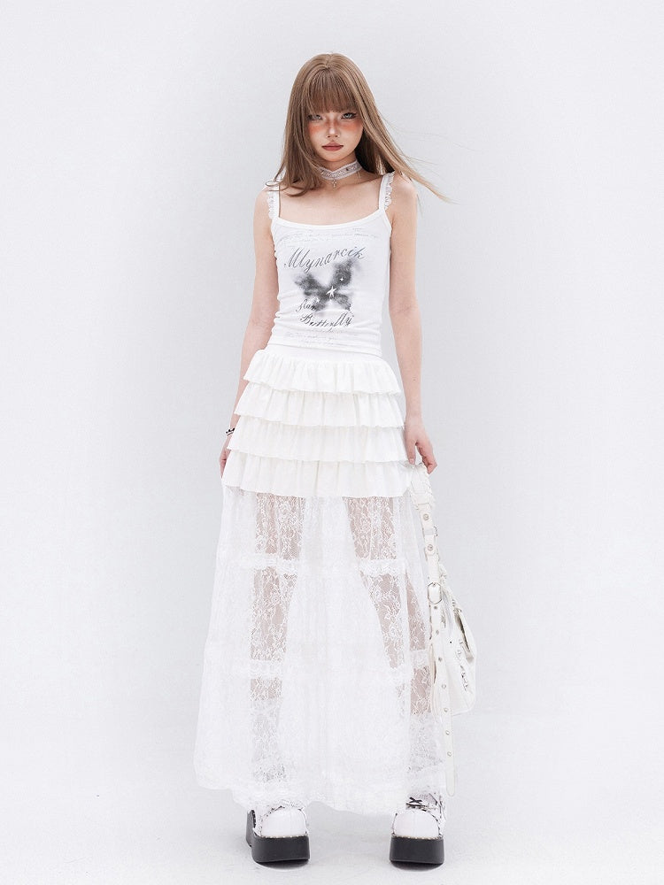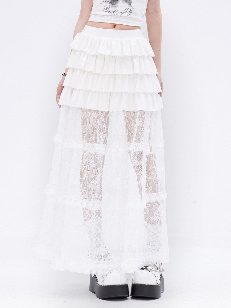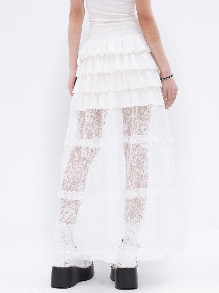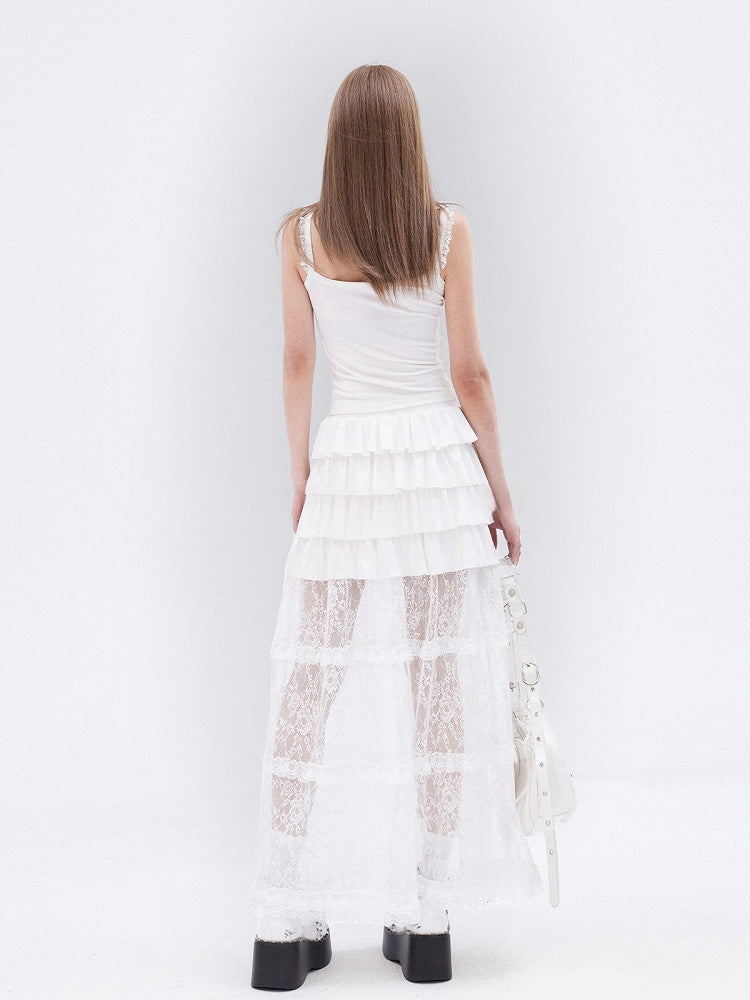 This adorable white long skirt features delicate lace and a charming tiered ruffle hem. With its elegant design, it is perfect for any occasion and will make you feel beautiful and feminine. Add a touch of loveliness to your wardrobe with this lovely skirt.