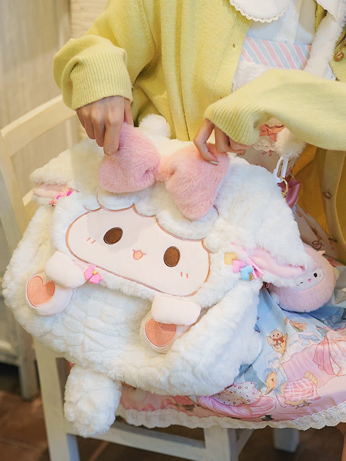 White Lamb Bowknot Plush Flap Backpack Bag Middle/Large Size