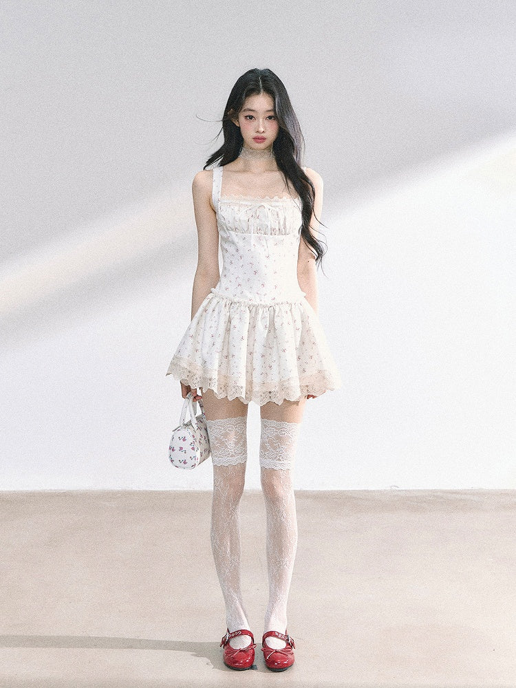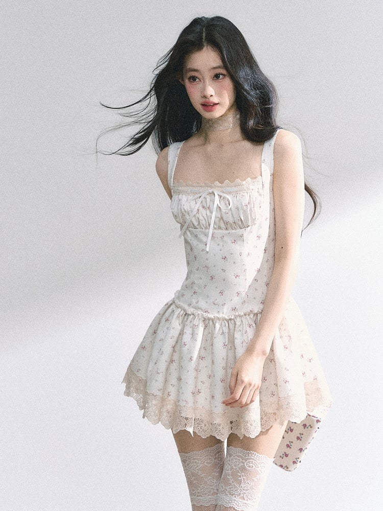 White Square Neckline Lace Trim Floral Sleeveless Dress