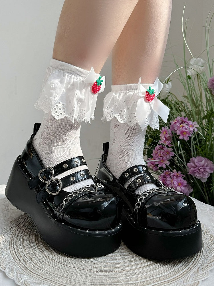 These sweet Lolita socks feature a white strawberry pattern and delicate lace trim, adding a charming touch to your outfit. Made with soft, durable material for comfortable wear. Perfect for adding a cute and playful touch to any look.