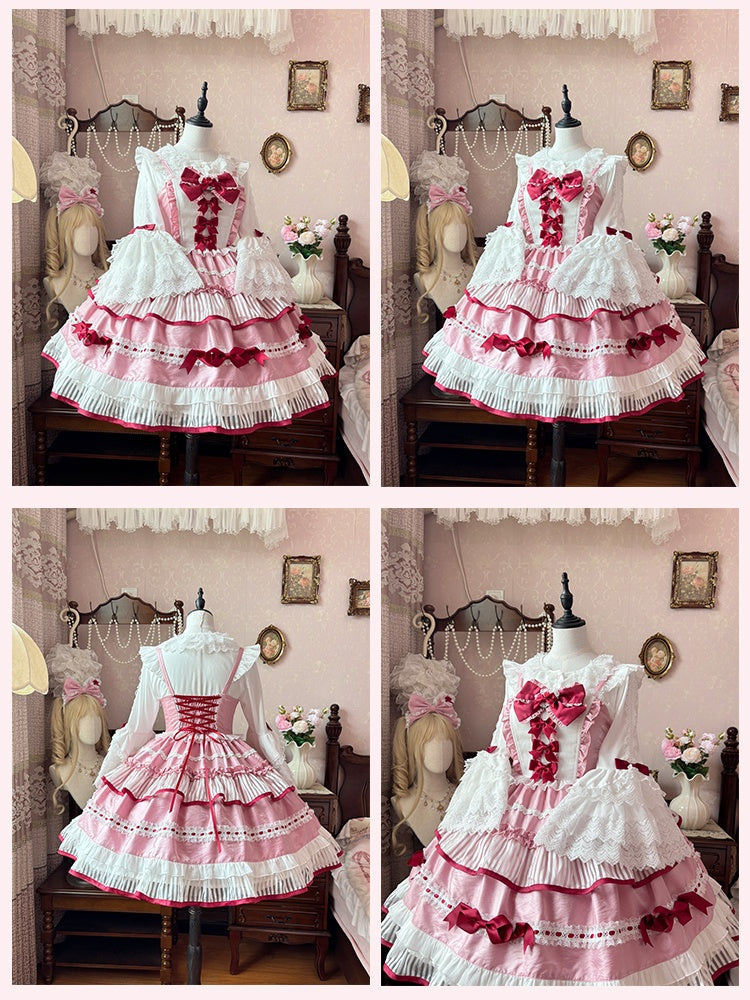 Pink and White Old School Lolita Fashion Dress Bowknot Detais Lolita JSK Set