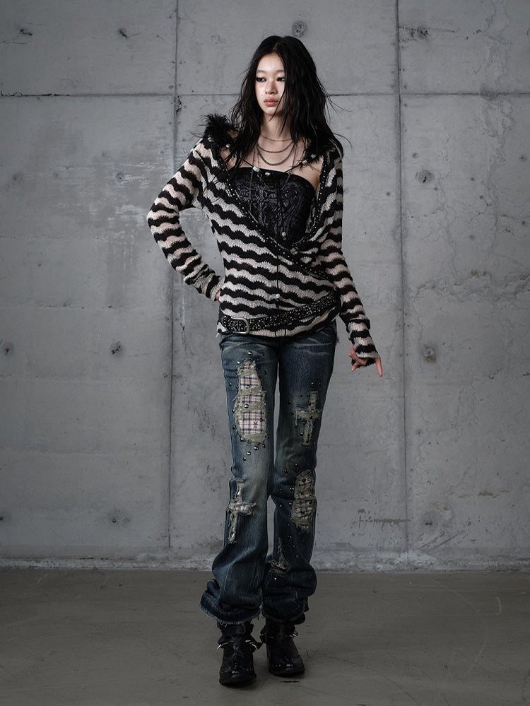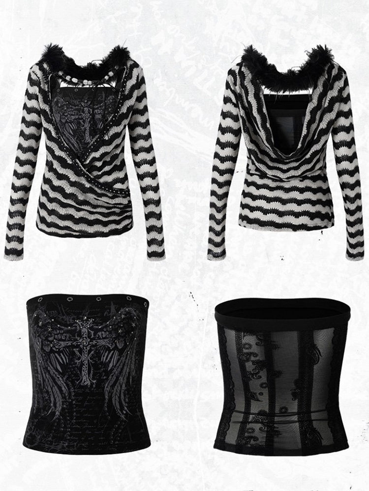 White with Vintage Set Deconstructed Fur Design Bustier Black Striped Top Faux Knit
