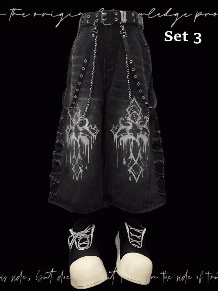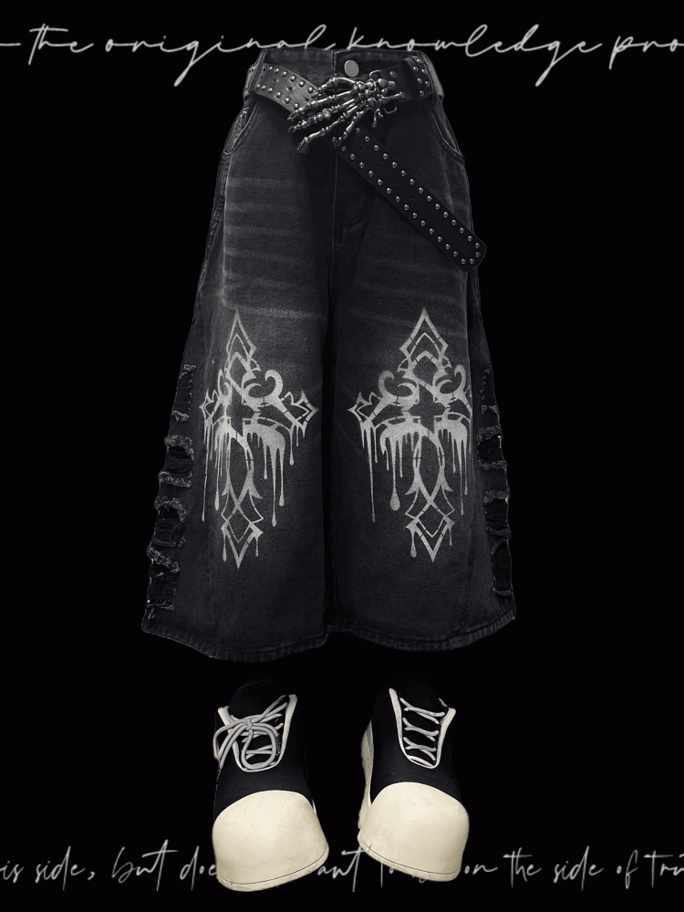 Dark Gray Cross Print Distressed Holes Raw Hem Wide-Leg Jeans