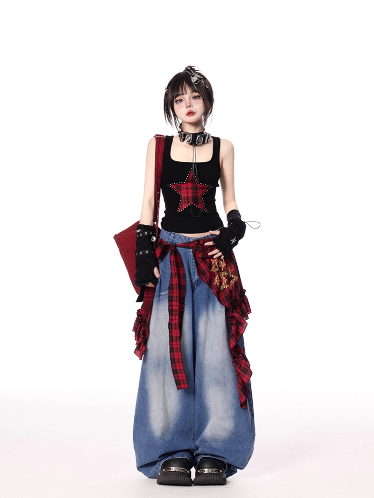 Wide-leg Jeans with Blue Accessory Plaid Faded Wash Vintage Red Rise Waist Low