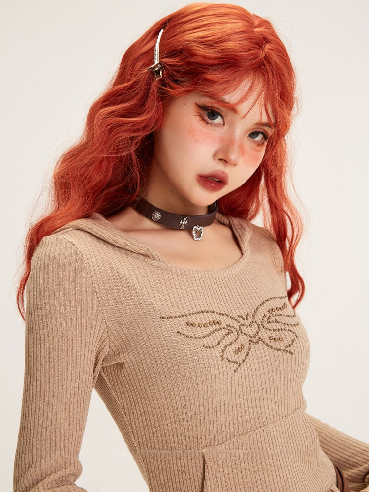 Beige Hooded Maxi Knit Dress with Belt & Studded Butterfly Design