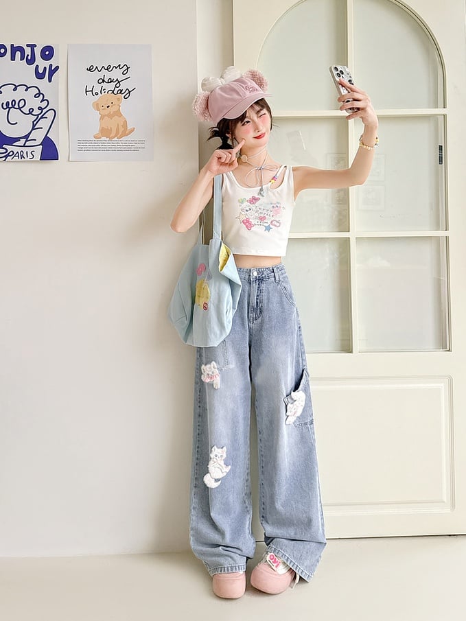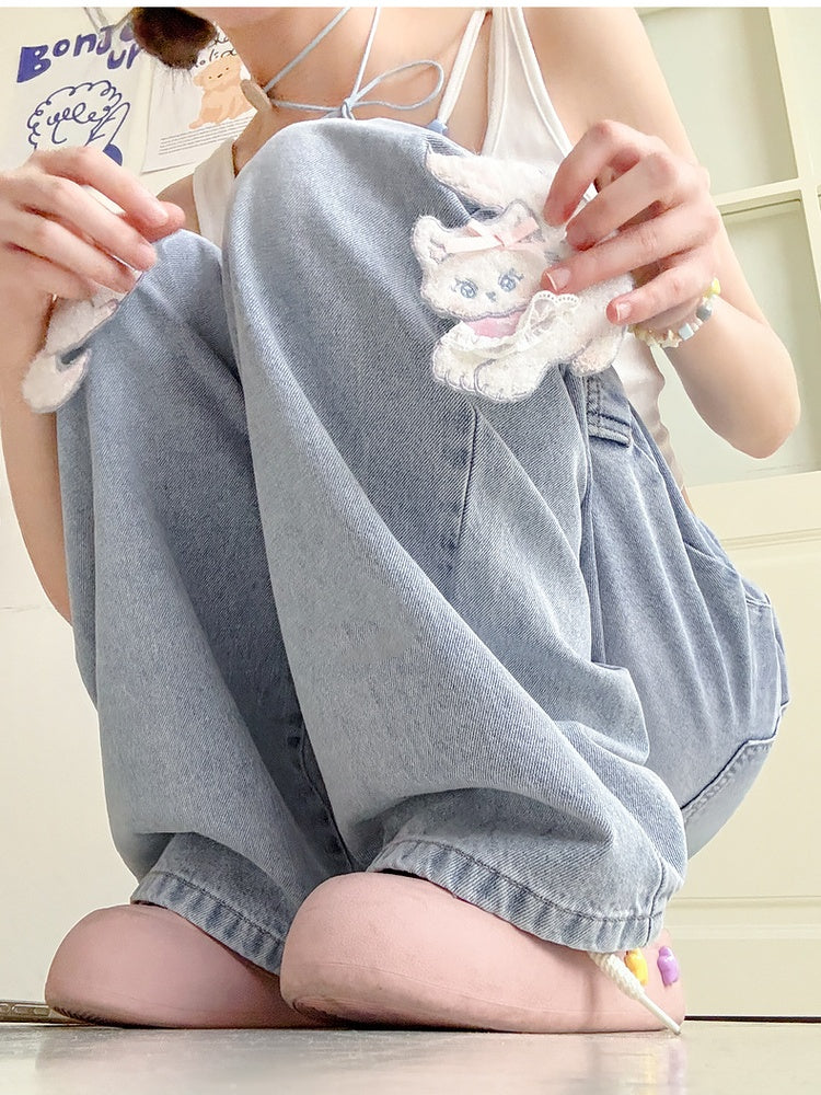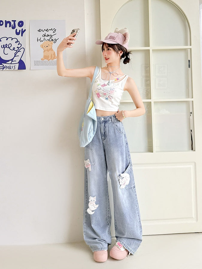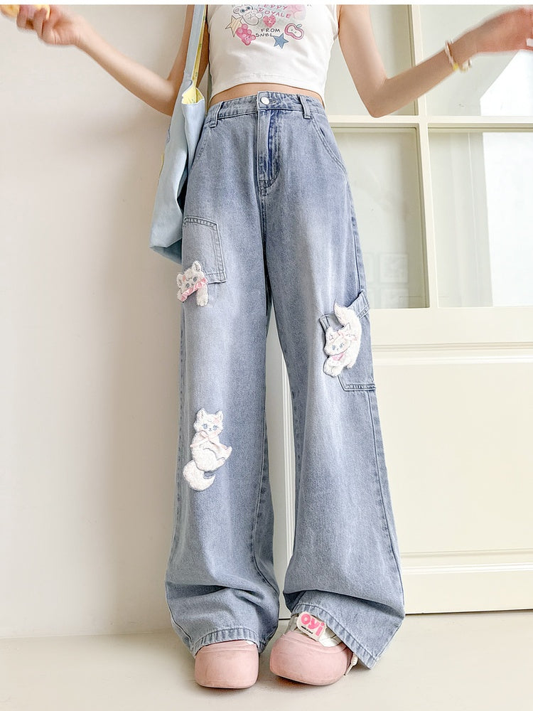 Blue Wide-Leg Jeans Short/Long Version with Detachable Kitty Appliques